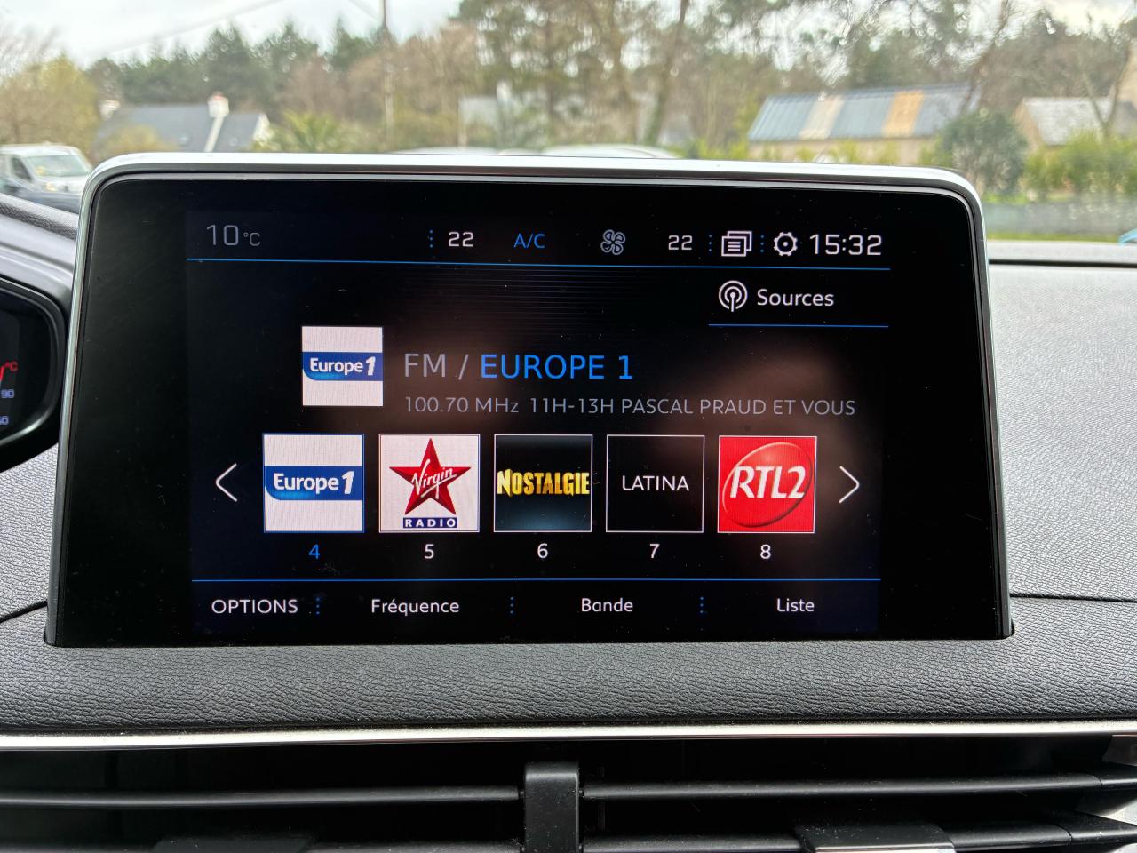ABS avec répartiteur électronique de freinage (REF) et aide au freinage d'urgence (AFU)Accoudoir central avant à ouverture papillon, avec compartiment de rangement éclairé et réfrigérableAide graphique et sonore au stationnement arrièreAide graphique et sonore au stationnement avantAir conditionné automatique bi-zone avec aérateurs aux places arrièreAirbags frontaux conducteur et passager adaptatifsAirbags latéraux conducteur et passager avantAirbags rideaux de tête aux places avant et arrièreAlerte de franchissement Involontaire de ligneAlerte de temps de conduiteAppuis-tête à sécurité optimisée réglables en hauteur sur les sièges conducteur et passager avant ainsi que sur les places latérales arrièresBandeau de pare-choc arrière chroméBanquette rabattable 1/3 - 2/3 (modularité 'Magic Flat' et commandes dans le coffre) avec accoudoir et trappe à skisBoîte à gants floquée et éclairéeCalandre avec jonc périphérique et facettes chromésCeintures avant à 3 points, réglables en hauteur, avec prétensionneurs et limiteurs d'effortCeintures de sécurité arrière trois points à enrouleur (x3), avec prétensionneurs et limiteurs d'effort aux places latéralesCommande de verrouillage à distance (deux plips)Contrôle dynamique de stabilité CDS avec antipatinage électronique ASRDécors de planche de bord et panneaux de portes aspect carboneDécors intérieurs (baguettes de planche de bord et panneaux de portes, enjoliveur de console) chromésDétection de sous-gonflage indirecteDeux porte-gobelets intégrés à la console centraleDirection assistée électrique, avec colonne de direction réglable en hauteur et profondeur (mécanique)Enjoliveurs d'arc de pavillon en inoxEssuie-glace arrière avec déclenchement automatique en marche arrièreEssuie-vitre avant avec système de lavage 'Magic Wash'Filets aumônières au dos des sièges avantFixations pour trois sièges enfants suivant norme ISOFIX aux places passager avant et latérales arrièreFonction Mirror Screen (Apple CarPlay / Android Auto)Frein de stationnement électrique avec aide au démarrage en penteIndicateur de rapportInserts d'ailes avant chromésJantes alliage 17" 'Chicago'Lève-vitres électriques avant et arrière, séquentiels et antipincementLunette arrière chauffante avec antennes sérigraphiéesPack VisibilitéPassages de roues rapportés noirsPeugeot Connect : Navigation 3D connectée avec reconnaissance vocale + PEUGEOT Connect SOS & AssistancePeugeot i-Cockpit combiné tête haute numérique reconfigurable, écran tactile capacitif 8" et volant compact multi-fonctionsPlafonnier avant avec spots de lecture (x2) et plafonnier arrière à extinction temporiséePlancher de coffre deux positionsPoignées de maintien (x4) rétractables avec frein (crochets pour cintres aux places arrière)Prise 12V (x3) : à l'avant, à l'arrière et dans le coffrePrise USBProjecteurs antibrouillard halogènes avec enjoliveurs chromésProjecteurs halogènes à l’avant avec feux diurnes à LED intégrés dans le bloc optiqueRégulateur et limiteur de vitesseRétroviseurs extérieur électriques et dégivrantsRétroviseurs extérieurs couleur carrosserieRétroviseurs extérieurs rabattables électriquement avec éclairage d'approche à LEDRadio 6 HP, compatible MP3 et connectivité Bluetooth (audio streaming, kit mains libres), avec commandes au volantReconnaissance des panneaux de vitesse et préconisationSécurité enfant électrique des vitres arrièreSellerie Tissu 'Meco'Siège conducteur réglage en hauteurSiège passager à réglage manuel en hauteurTeinte de caisse Gris HurricaneToggle Switches' chromés (touches 'piano' d'activation des fonctions de l'écran tactile)Verrouillage automatique de tous les ouvrants en roulantVitres latérales et lunette arrière surteintéesVolant cuir pleine fleur
