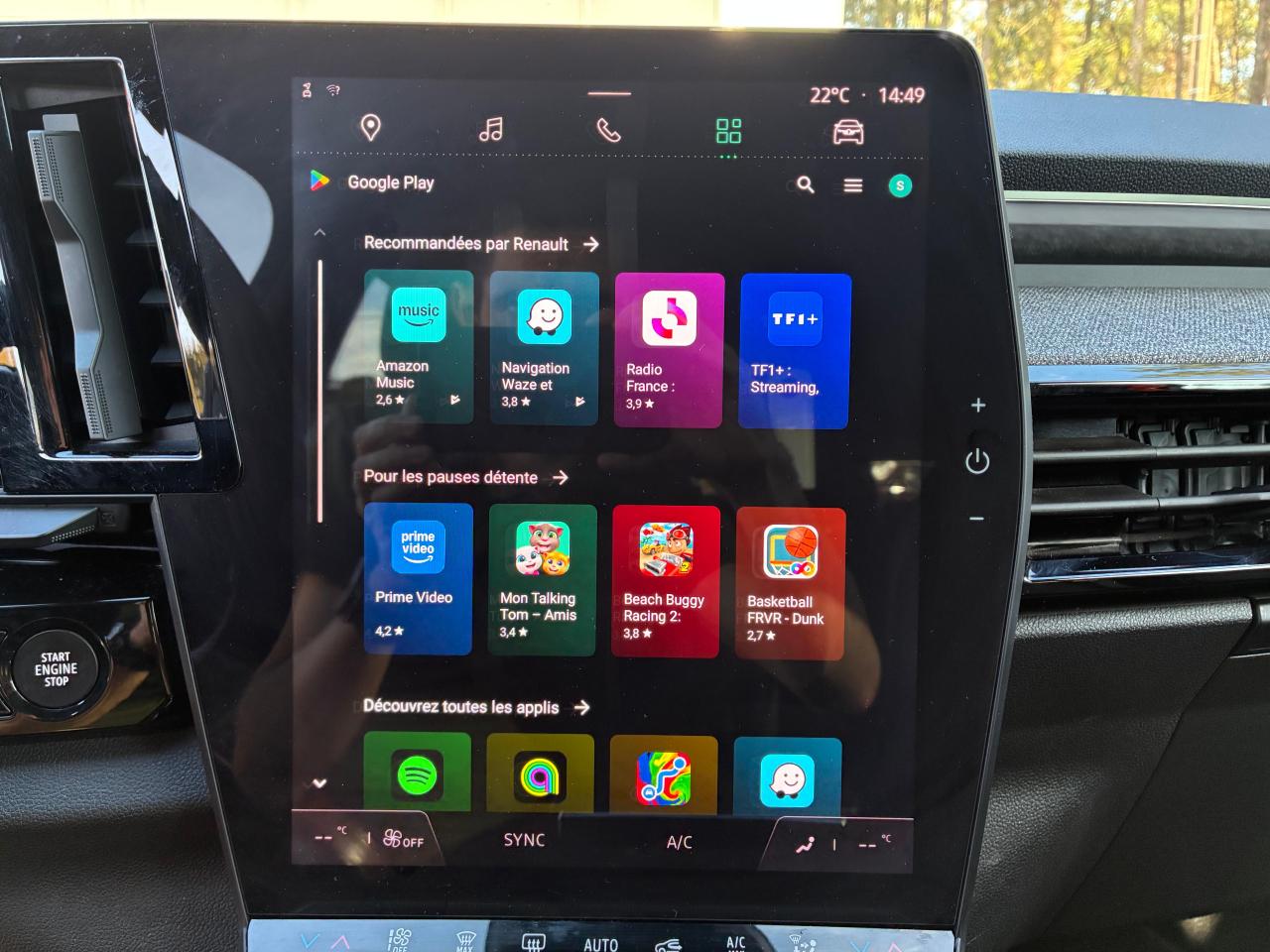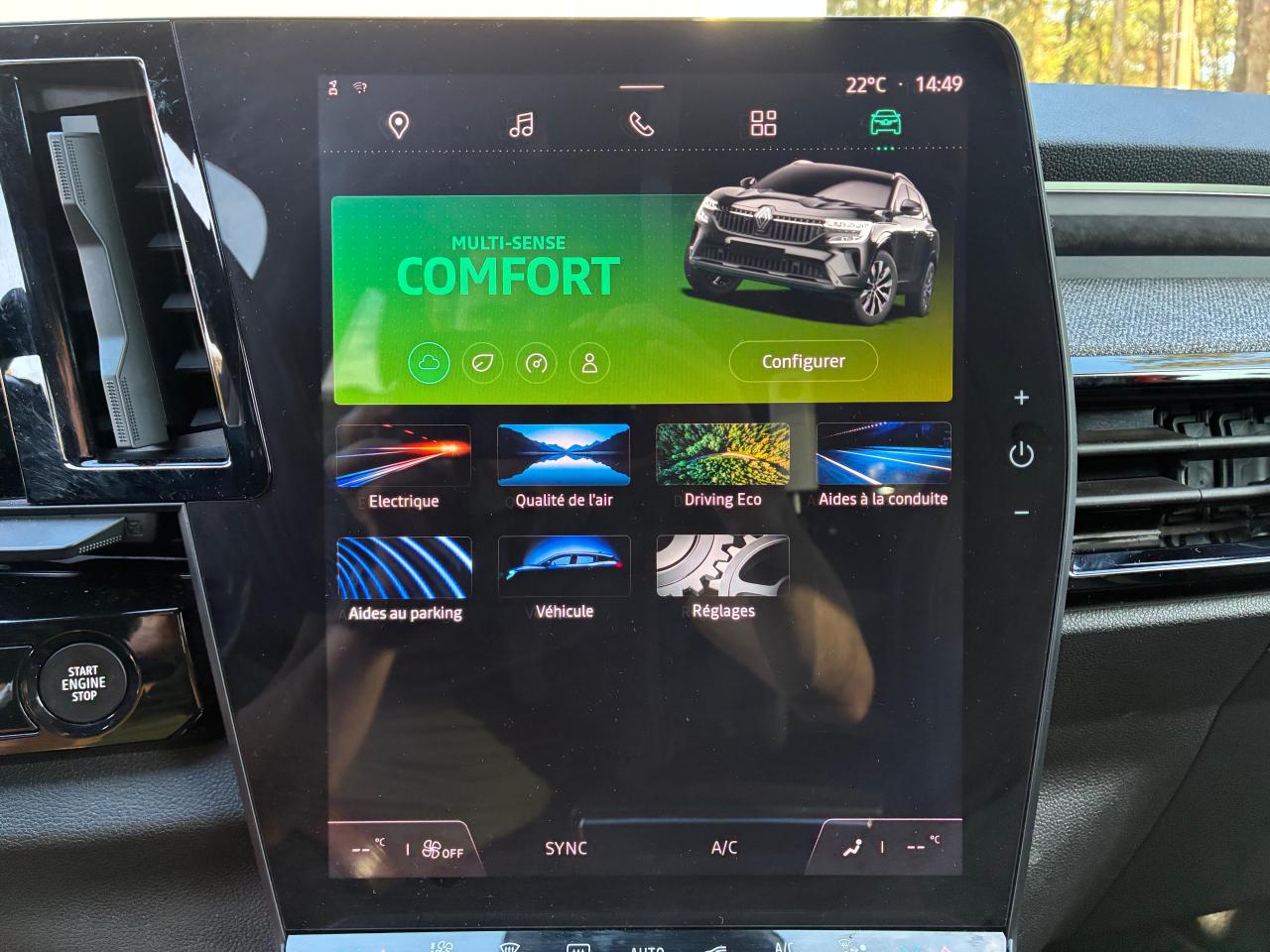 6 haut-parleurs7 placesAccès et démarrage mains-libresAccoudoir central et inserts de portes en textile enduit grainé avec surpiqûres argentAide au démarrage en côteAide au maintien dans la voieAide au parking avant, arrière et latéralAlerte de franchissement de ligneAlerte distance de sécuritéAntenne de toit « aileron de requin »Assistant de stabilité de remorqueAvertisseur d'angle mort et prévention de sortie de voie en cas de dépassementAvertisseur de sortie de stationnement en marche arrière avec freinage d'urgence automatiqueBanquette arrière coulissante sur 22 cmBarres de toit longitudinales chroméesBas de caisse en noir brillantBouclier avant avec lame sport ton caisseCalandre à barreaux verticaux ice blackCaméra de reculCapteur de pluieChargeur de smartphone par inductionClimatisation automatique bi-zoneFeux avant LED Adaptative VisionFonction appel d'urgenceFrein à main automatiqueFreinage d'urgence autonome avec fonction intersectionFreinage d’urgence automatique urbain/péri-urbain avec détection piétons et cyclistesGestion automatique des feux de route /feux de croisementHayon électrique mains libresJantes alliage 19" Komah diamantées noiresLimiteur de vitesseMise à jour système inclus pendant 5 ansNotice d’utilisation digitale embarquée dans le système multimédia du véhiculePack contrôle à distance (via l’application My Renault) inclus pendant 5 ansPassages de roue noir brillantRégulateur de vitesseRenault MULTI-SENSE (choix des modes de conduite)Réplication smartphone compatible Android Auto & Apple CarPlayRétroviseur intérieur électrochrome sans contourRétroviseurs extérieurs à réglages électriques, dégivrants et rabattables automatiquementSellerie mixte tissu gris avec surpiqûres chocolat / textile enduit grainéSiège passager réglable en hauteurSon auditorium ArkamysSortie sécurisée des occupantsSystème de surveillance de la vigilance du conducteurSystème OpenR Link avec écran tactile 12" et navigation Google Maps, Google Play et Google AssistantTableau de bord avec insert en textile grisVitres arrière surteintéesVolant gainé cuir