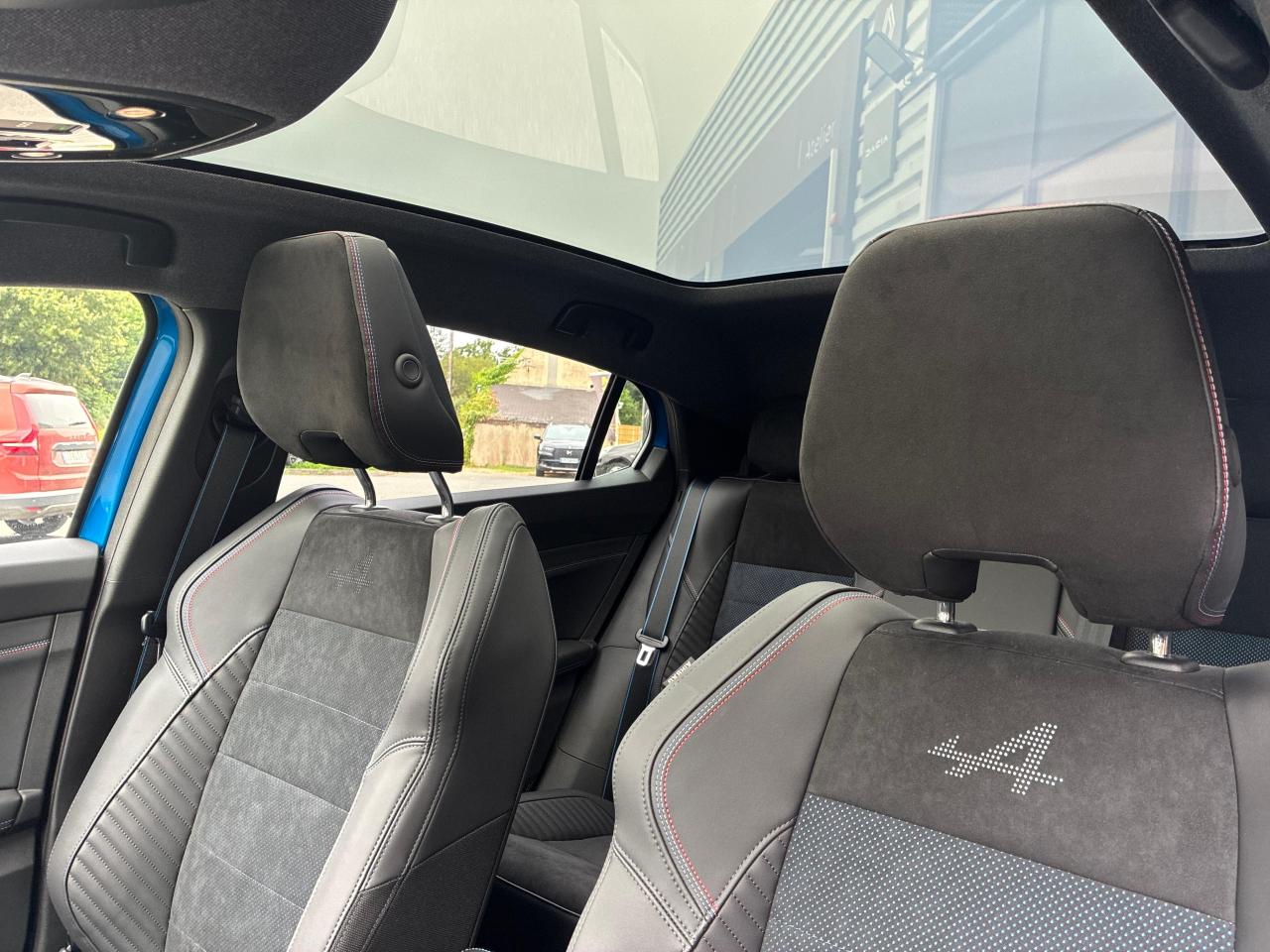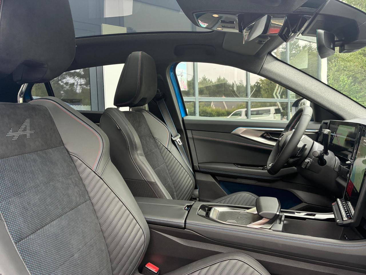 4Control advancedAccoudoir arrière ingenius avec supports tablette et smartphone, 2 prises USB-C et porte-gobeletsAccoudoir central avec surpiqûres bleues et inserts de porte en textile refined avec surpiqûres bleu / blanc / rougeAide au démarrage en côteAide au maintien dans la voieAide au parking avant et latéralAide au stationnement arrièreAlerte de franchissement de ligneAlerte distance de sécuritéAntenne de toit « aileron de requin »Assistant de stabilité de remorqueAvertisseur de changement de voieBacs de porte avant et arrière avec floquage bleuBadge esprit AlpineBanquette 40/20/40 avec trappes à skisBouclier avant avec pièces décor gris schisteCalandre 3D avec fond bleu sommet satinCaméra de reculCarte Renault, accès et démarrage « mains-libres »Chargeur de smartphone par inductionClimatisation automatique bi-zoneConduite hybride prédictiveConnectivité smartphone Apple CarPlay & Android Auto sans filContours de vitres ice blackEssuie-glace à déclenchement automatiqueFeux arrière à LED avec effet « glaçon flottant » et clignotants à défilementFeux LED adaptive vision (avec fonction antibrouillard intégrée)Finition planche de bord ardoiseFrein de parking électrique avec fonction Auto-HoldFreinage d'urgence autonome avec fonction intersectionFreinage d’urgence automatique urbain/péri-urbain avec détection piétons et cyclistesGestion automatique des feux de route /feux de croisementHayon motoriséJantes alliage diamantées noires 20” Castellet avec vernis fumé grisLimiteur de vitesseLogo avant et arrière ice blackMise à jour système inclus pendant 5 ansMonogramme ice blackMulti-sense : personnalisation des modes de conduite et ambiance intérieureNotice d’utilisation digitale embarquée dans le système multimédia du véhiculeOpen R Link 12": système multimédia avec google intégré incluant pack navigation (Google Mpas et Google Assistant) pendant 5 ans et pack infotainment (Google Play)Pack contrôle à distance (via l’application My Renault) inclus pendant 5 ansPack SafetyPédalier en aluminiumRégulateur de vitesse adaptatifRétroviseur intérieur électrochrome sans contourRétroviseurs extérieurs réglables, rabattables électriquement et dégivrantsSellerie Alcantara recyclée avec perforations bleues / tissu refined grain fin avec surpiqûres bleu / blanc / rougeSellerie avec signature lumineuse « A fléché »Séquence d’accueil dédiéeSeuil de coffre chroméSeuil de porte logotypéSiège passager réglable en hauteurSièges avant chauffantsSièges avant sport avec maintiens latéraux renforcésSystème audio Arkamys auditorium avec 6 haut-parleursSystème d'appel d'urgenceSystème de reconnaissance des panneaux de signalisation avec alerte de survitesse (inclus pendant 14 ans)Système de surveillance de la vigilance du conducteurVitres arrière surteintéesVolant en textile refined grain finVolant spécifique avec insert Alcantara